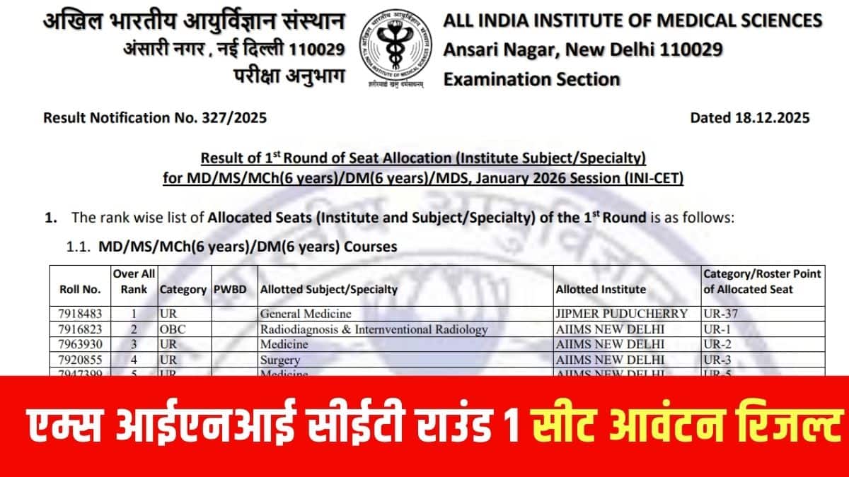 नई दिल्ली : अखिल भारतीय आयुर्विज्ञान संस्थान (AIIMS) नई दिल्ली ने इंस्टीट्यूट ऑफ नेशनल इंपॉर्टेंस कॉमन एंट्रेंस टेस्ट (INI CET) जनवरी 2026 काउंसलिंग के पहले राउंड का सीट आवंटन परिणाम घोषित कर दिया है। उम्मीदवार आईएनआई सीईटी राउंड 1 सीट आवंटन परिणाम 2025 आधिकारिक वेबसाइट aiimsexams.ac.in के माध्यम से डाउनलोड कर सकते हैं और 24 दिसंबर तक कॉलेज में रिपोर्ट कर सकते हैं।