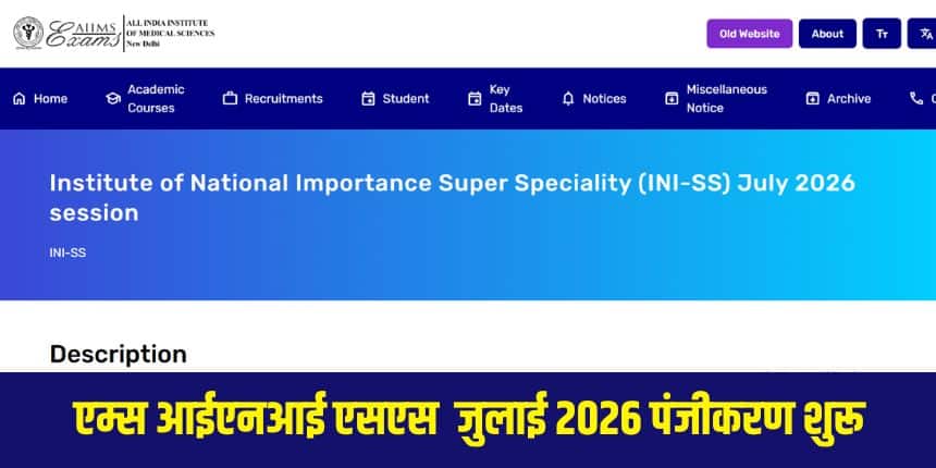 नई दिल्ली : ऑल इडिया इंस्टीट्यूट ऑफ मेडिकल साइंसेस (AIIMS) ने इंस्टीट्यूट ऑफ नेशनल इंपोर्टेंस सुपर स्पेशियलिटी (INI-SS) जुलाई 2026 सेशन के लिए रजिस्ट्रेशन की प्रक्रिया शुरू कर दी है। इच्छुक और पात्र उम्मीदवार आधिकारिक वेबसाइट aiimsexams.ac.in के माध्यम से ऑनलाइन आवेदन कर सकते हैं। आवेदन पत्र जमा करने की आखिरी तारीख 13 अप्रैल है।