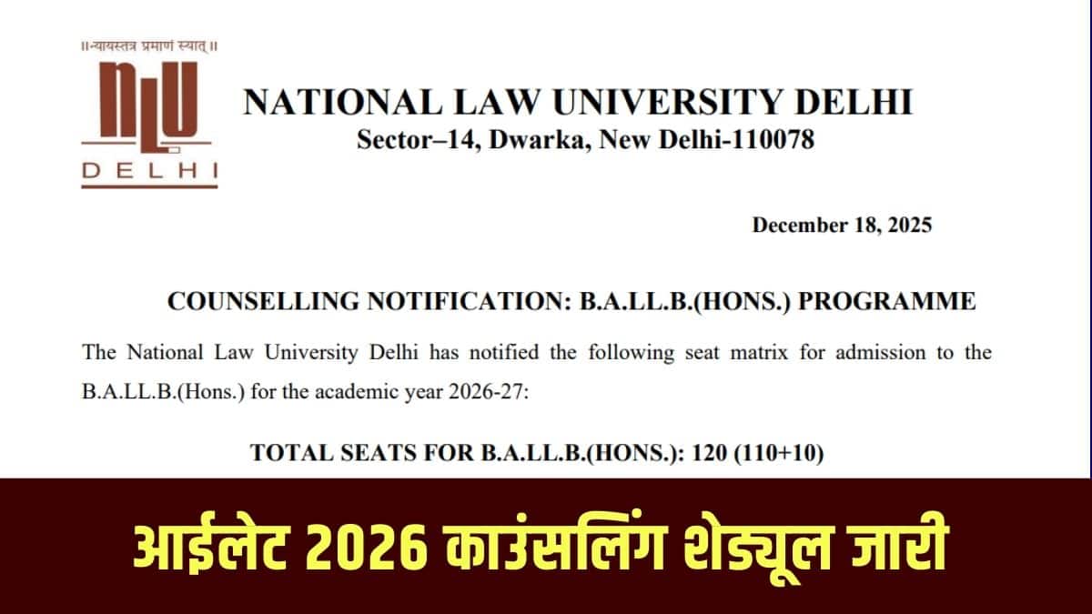 नई दिल्ली : नेशनल लॉ यूनिवर्सिटी (एनएलयू) दिल्ली ने बीए एलएलबी (ऑनर्स) और एलएलएम कार्यक्रमों में प्रवेश के लिए ऑल इंडिया लॉ एंट्रेंस टेस्ट 2026 की ऑनलाइन काउंसलिंग का कार्यक्रम घोषित कर दिया है। AILET 2026 काउंसलिंग के लिए पंजीकरण लिंक कल, 19 दिसंबर को शाम 6 बजे खुलेगा।