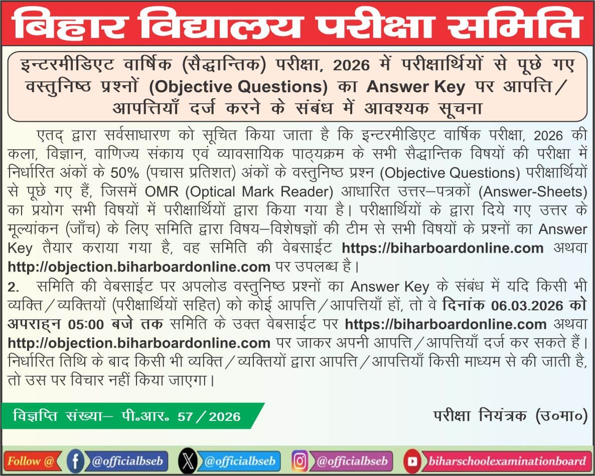 यदि किसी परीक्षार्थी को बोर्ड की वेबसाइट पर अपलोड की गई वस्तुनिष्ठ प्रश्नों की उत्तर कुंजी के संबंध में कोई आपत्ति है, तो वे बोर्ड की वेबसाइट biharboardonline.com या objection.biharboardonline.com पर जाकर 6 मार्च 2026 को शाम 5 बजे तक अपनी आपत्तियां दर्ज करा सकते हैं।