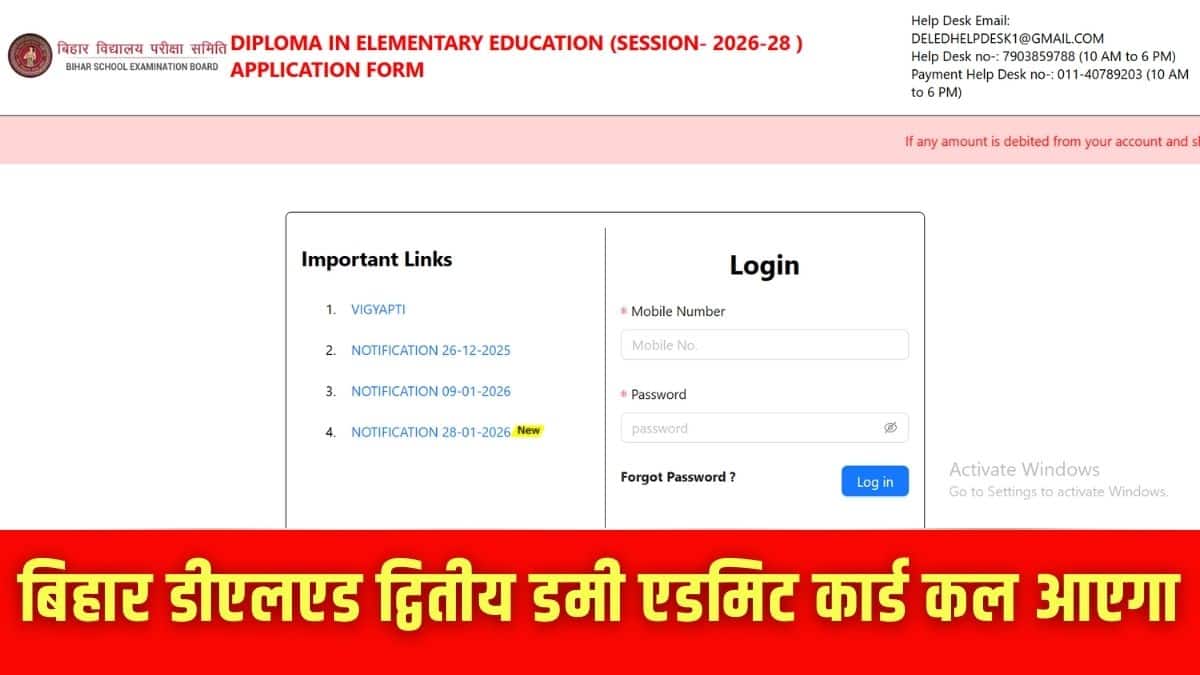 नई दिल्ली: बिहार स्कूल एग्जामिनेशन बोर्ड (बीएसईबी) द्वारा आयोजित डिप्लोमा इन एलिमेंट्री एजुकेशन (डीएलएड) जॉइंट एंट्रेंस टेस्ट 2026 का द्वितीय डमी एडमिट कार्ड कल जारी किया जाएगा। डमी एडमिट कार्ड ऑफिशियल वेबसाइट bsebdeled.com पर अपलोड रहेगा। प्रथम डमी एडमिट कार्ड 28 जनवरी को जारी किया गया और सुधार करने की आखिरी तारीख 2 फरवरी थी। द्वितीय डमी एडमिट कार्ड जारी होने के बाद, उम्मीदवार अपने फाइनल डिटेल्स वेरिफाई कर पाएंगे।