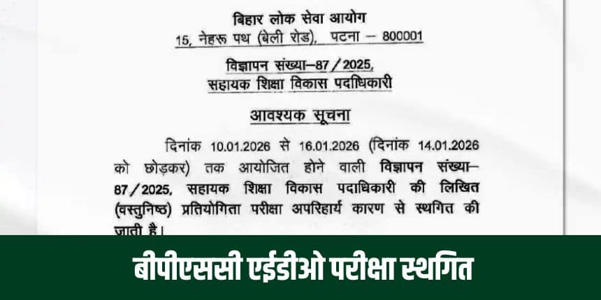 बीपीएससी की तरफ से जारी नोटिस में कहा गया है कि 10 से 16 जनवरी (14 जनवरी को छोड़कर) 2026 तक आयोजित होने वाली सहायक शिक्षा विकास पदाधिकारी (एईडीओ) की लिखित (वस्तुनिष्ठ) प्रतियोगिता परीक्षा अपरिहार्य कारण से स्थगित की जाती है। परीक्षा के दोबारा आयोजन की तिथि की घोषणा आयोग की वेबसाइट पर प्रकाशित की जाएगी।