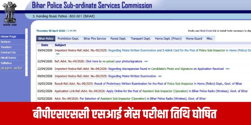 नई दिल्ली : बिहार पुलिस अवर सेवा आयोग (BPSSC) ने पुलिस सब इंस्पेक्टर पदों पर भर्ती के लिए मुख्य लिखित परीक्षा का आधिकारिक कार्यक्रम जारी कर दिया है। पहले यह परीक्षा 19 अप्रैल 2026 को आयोजित होनी थी, लेकिन इसे स्थगित कर दिया गया था। अब आयोग के नए नोटिस के अनुसार यह परीक्षा 27 मई 2026 (बुधवार) को राज्य के विभिन्न केंद्रों पर आयोजित की जाएगी।