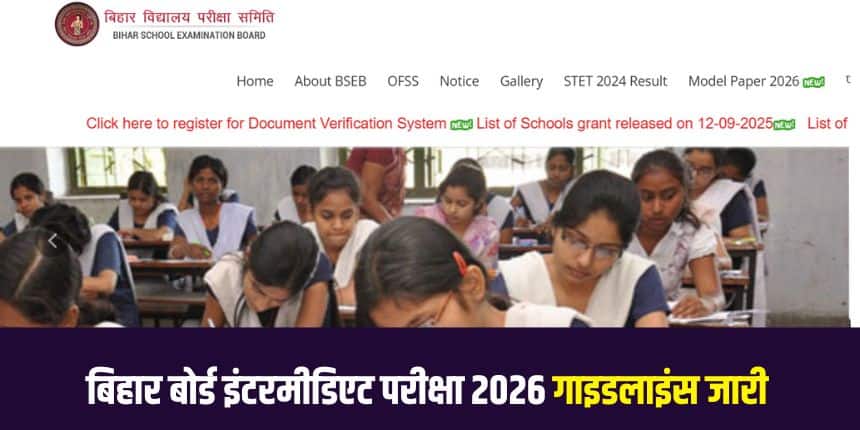 नई दिल्ली : बिहार विद्यालय परीक्षा समिति (बीएसईबी) ने बिहार बोर्ड कक्षा 12वीं की परीक्षा के संबंध में गाइडलाइंस जारी कर दी है। बिहार विद्यालय परीक्षा समिति द्वारा कुल 13,17,846 परीक्षार्थियों के लिए इंटरमीडिएट वार्षिक परीक्षा, 2026 का आयोजन राज्य के 1,762 परीक्षा केन्द्रों पर 2फरवरी 2026 से 13 फरवरी 2026 के बीच दो पालियों में किया जाएगा। इस परीक्षा में 6,75,844 छात्राएं तथा 6,42,002 छात्र शामिल होंगे।