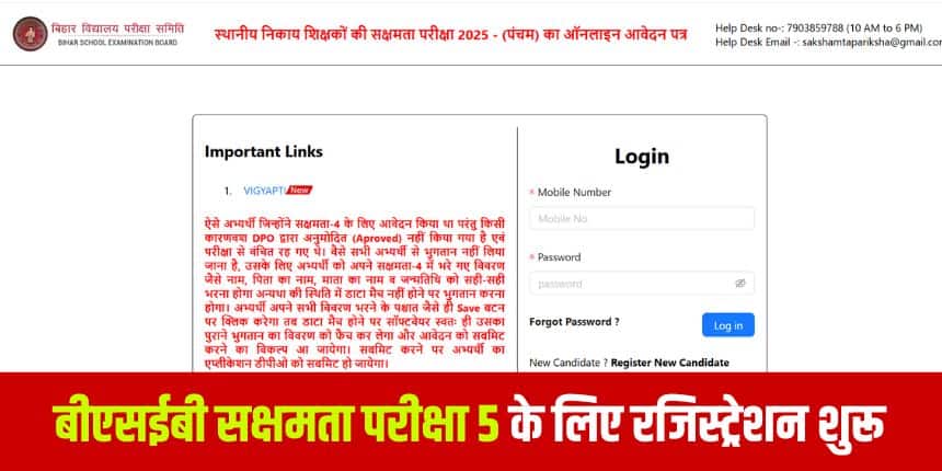 नई दिल्ली : बिहार विद्यालय परीक्षा समिति (बीएसईबी) की तरफ से बिहार सक्षमता परीक्षा फेज-5 के लिए ऑनलाइन रजिस्ट्रेशन शुरू हो गए हैं। इच्छुक और पात्र उम्मीदवार जो इस परीक्षा में शामिल होना चाहते हैं। वे अब आधिकारिक वेबसाइट https://sakshamtabihar.com/ पर जाकर ऑनलाइन आवेदन कर सकते हैं।