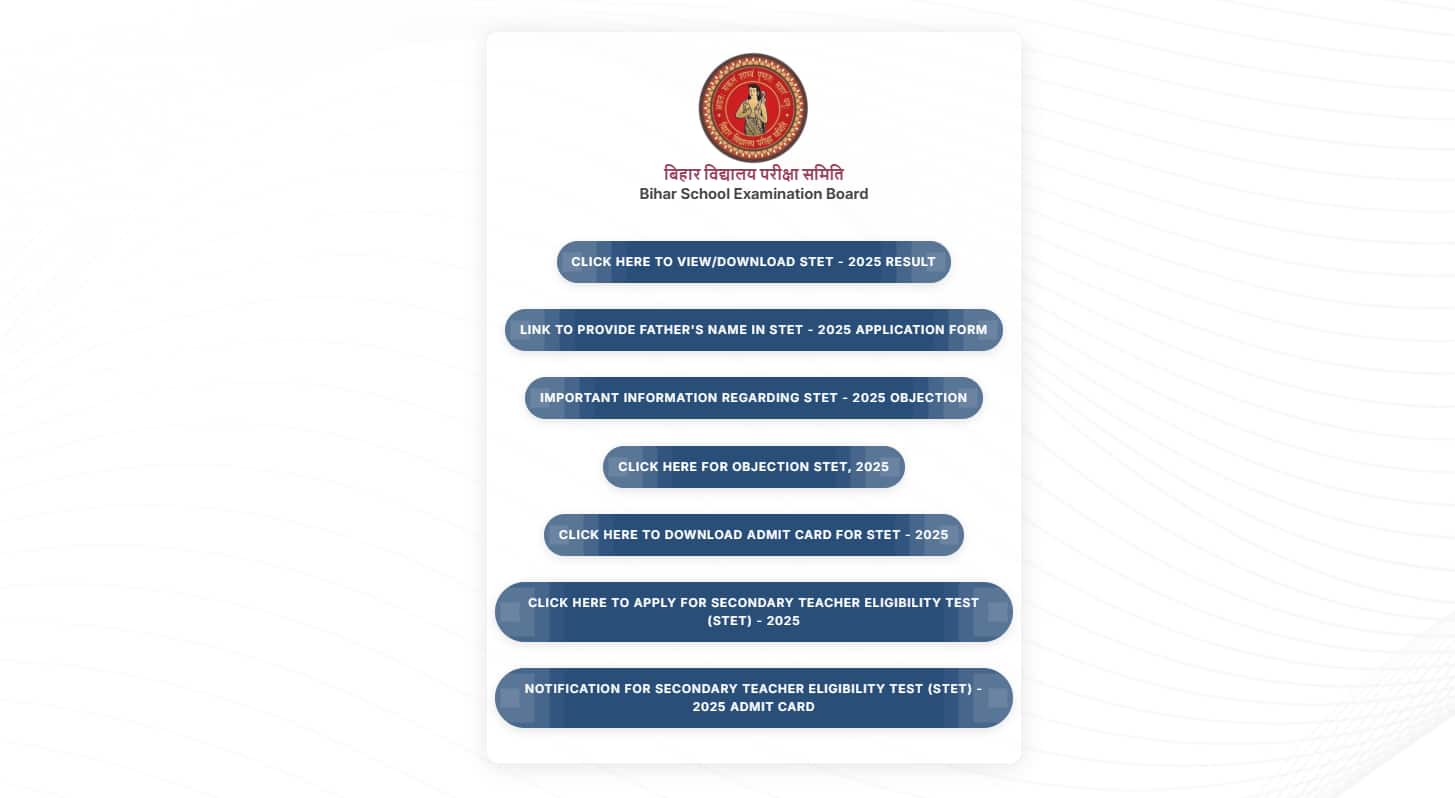 आधिकारिक घोषणा के बाद उम्मीदवार ऑफिशियल वेबसाइट bsebstet.org पर जाकर बीएसईबी बिहार एसटीईटी रिजल्ट 2025 डाउनलोड कर सकते हैं।