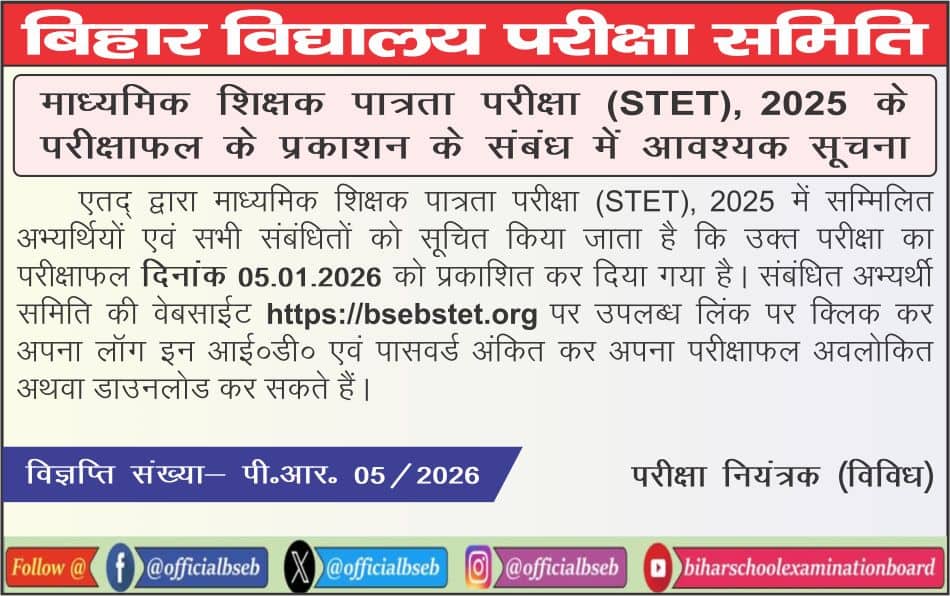 बिहार स्कूल एग्जामिनेशन बोर्ड के चेयरमैन आनंद किशोर आज, 5 जनवरी 2026 को शाम 4:15 बजे सेकेंडरी टीचर एलिजिबिलिटी टेस्ट (STET) के नतीजे जारी करेंगे।