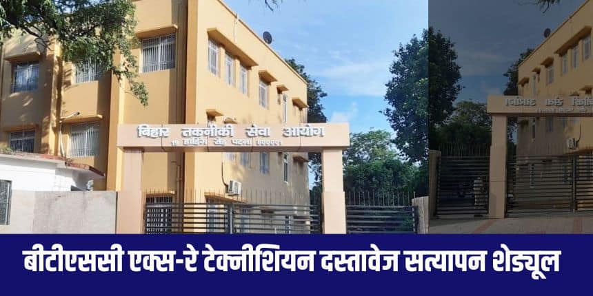 बिहार एक्स-रे टेक्नीशियन पदों के लिए चयनित उम्मीदवारों के दस्तावेज सत्यापन का कार्य 23 से 25 मार्च 2026 तक दो पालियों- पहली पाली सुबह 10 से दोपहर 1:30 बजे एवं दूसरी पाली दोपहर 2 बजे शाम 5:30बजे तक बिहार तकनीकी सेवा आयोग, 19, हार्डिंग रोड, पटना में संभावित है।