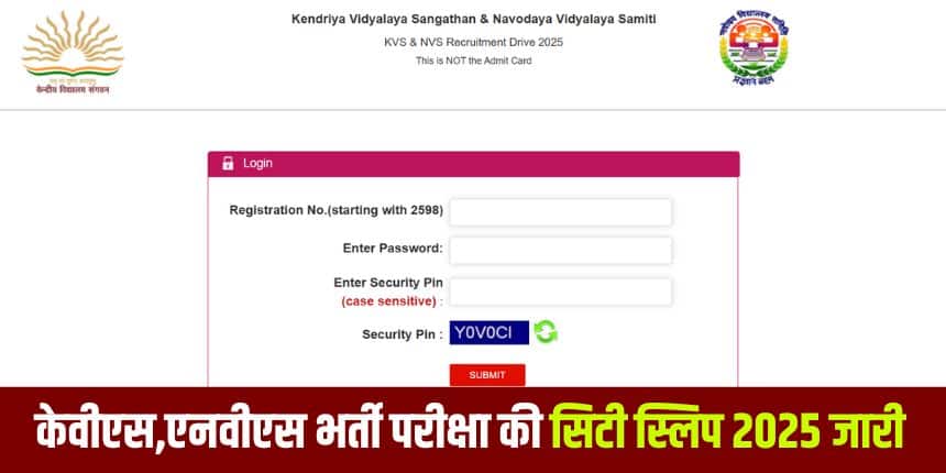 केवीएस, एनवीएस सिटी स्लिप 2025 डाउनलोड करने के लिए उम्मीदवारों को अपने रजिस्ट्रेशन नंबर (2598 से शुरू होता है), पासवर्ड और सुरक्षा पिन दर्ज कर लॉगिन करना होगा। उम्मीदवार अपनी परीक्षा के शहर की जानकारी प्राप्त करने के लिए स्लिप को केवल आधिकारिक वेबसाइटों, जैसे cbse.gov.in, kvsangathan.nic.in या navodaya.gov.in से डाउनलोड कर सकते हैं।