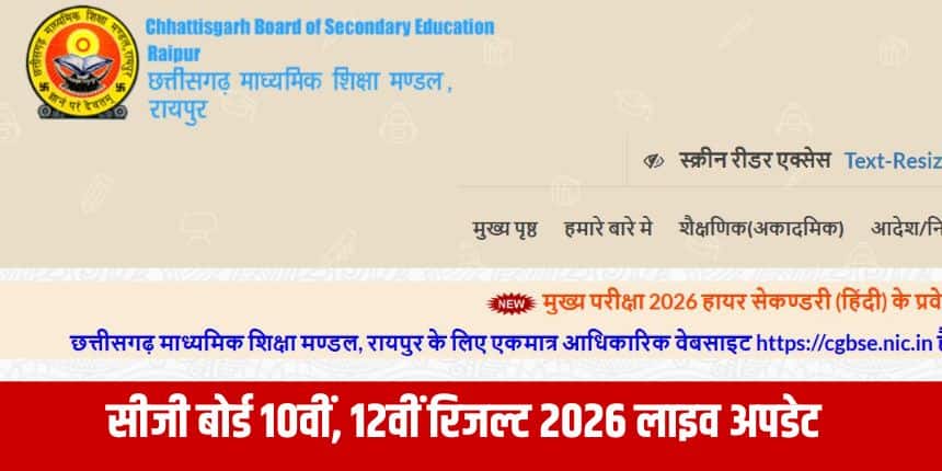 Check Nowनई दिल्ली : छत्तीसगढ़ माध्यमिक शिक्षा बोर्ड (CGBSE) जल्द ही कक्षा 10वीं और 12वीं के परिणाम जारी करने वाला है। मीडिया रिपोर्ट्स के अनुसार, रिजल्ट जल्द ही घोषित किए जा सकते हैं। छत्तीसगढ़ बोर्ड की आधिकारिक वेबसाइट पर सीजीबीएसई 10वीं और 12वीं के परिणाम 2026 उपलब्ध होंगे।