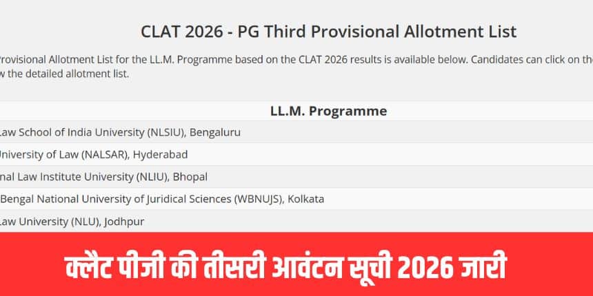 क्लैट की चौथी आवंटन सूची 2026 स्नातकोत्तर प्रवेश के लिए 2 मई को प्रकाशित की जाएगी। इस बीच, इलाहाबाद उच्च न्यायालय द्वारा प्रश्न संख्या 9 के लिए अंक देने के लिए योग्यता सूची और उत्तर कुंजी में संशोधन करने के निर्देश के बाद कंसोर्टियम ने सीएलएटी यूजी की तीसरी आवंटन सूची स्थगित कर दी है।