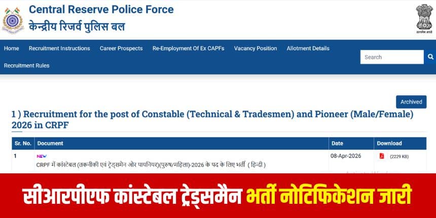 नई दिल्ली : केंद्रीय रिजर्व पुलिस बल (सीआरपीएफ) ने सीआरपीएफ कांस्टेबल महिला-पुरुष (तकनीकी एवं ट्रेड्समैन और पायनियर) भर्ती 2026 की आधिकारिक अधिसूचना जारी की है। इन रिक्तियों के लिए आवेदन प्रक्रिया 20 अप्रैल से शुरू होगी। इच्छुक और पात्र उम्मीदवार आधिकारिक वेबसाइट rect.crpf.gov.in के माध्यम से 19 मई 2026 तक आवेदन फॉर्म जमा कर सकते हैं।