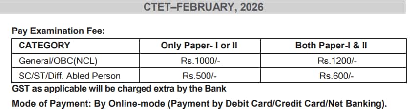 सीटेट 2026 पंजीकरण शुल्क के रूप में सामान्य/ ओबीसी (एनसीएल) को पेपर-1 या पेपर-2 के लिए 1000 रुपये और पेपर-1 और पेपर-2 के लिए 1200 रुपये का भुगतान करना होगा।