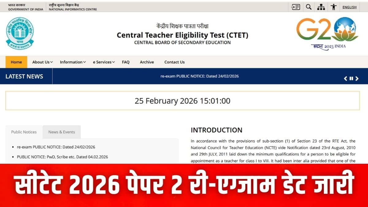 नई दिल्ली: सेंट्रल बोर्ड ऑफ सेकेंडरी एजुकेशन (सीबीएसई) ने सीटीईटी फरवरी 2026 सेशन के प्रभावित कैंडिडेट्स के लिए पेपर 2 का री-एग्जाम 1 मार्च को कराने का फैसला किया है। बिहार के वैशाली जिले में दो एग्जाम सेंटर्स (सेंट जॉन्स एकेडमी और लक्ष्य इंटरनेशनल एकेडमी, महुआ) पर 8 फरवरी को पेपर 2 का एग्जाम कैंसिल कर दिया गया। इन सेंटर्स पर शामिल हुए प्रभावित कैंडिडेट्स को अब 1 मार्च को दोबारा एग्जाम देने का मौका मिलेगा।