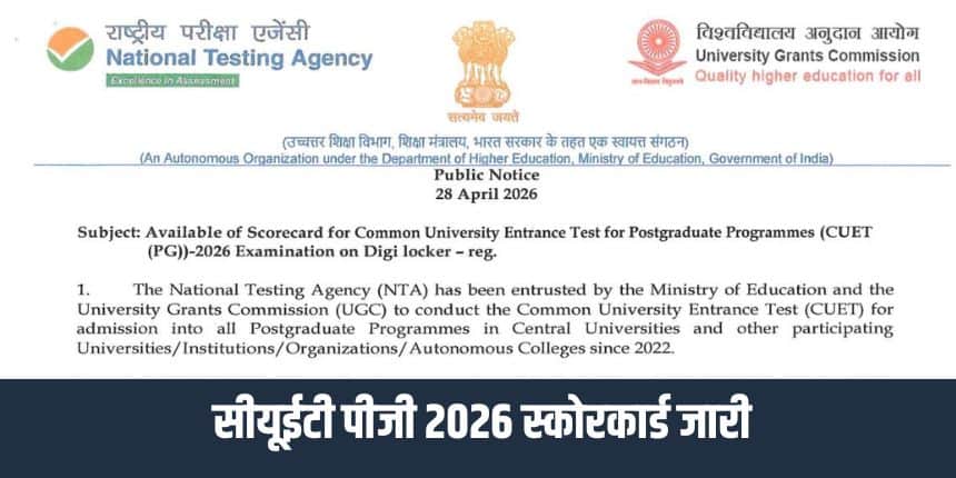 नई दिल्ली : राष्ट्रीय परीक्षा एजेंसी ने कॉमन यूनिवर्सिटी एंट्रेंस टेस्ट (सीयूईटी) पीजी 2026 का स्कोरकार्ड जारी कर दिया है। सीयूईटी पीजी में शामिल हुए उम्मीदवार अब आधिकारिक वेबसाइट exams.nta.nic.in/CUET-PG के माध्यम से अपना स्कोरकार्ड देख और डाउनलोड कर सकते हैं।