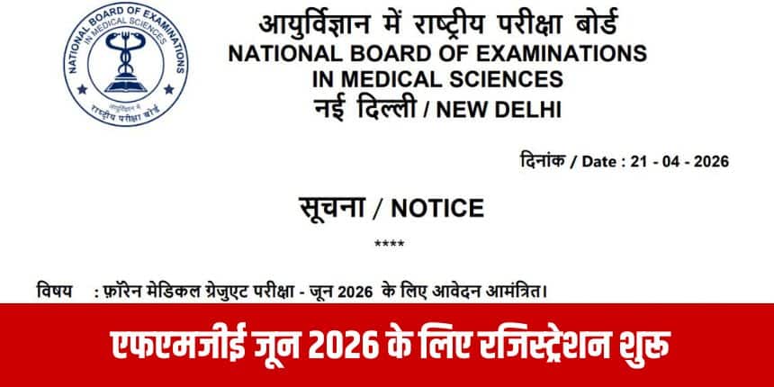 नई दिल्ली : नेशनल बोर्ड ऑफ एग्जामिनेशंस इन मेडिकल साइंसेज (NBEMS) ने फॉरेन मेडिकल ग्रेजुएट परीक्षा (एफएमजीई) जून सत्र के लिए पंजीकरण प्रक्रिया शुरू कर दी है। जो उम्मीदवार जून 2026 सत्र के लिए एफएमजीई में शामिल होना चाहते हैं, वे आधिकारिक वेबसाइट natboard.edu.in पर जाकर ऑनलाइन आवेदन कर सकते हैं। आवेदन फॉर्म जमा करने की आखिरी तारीख 11 मई है।