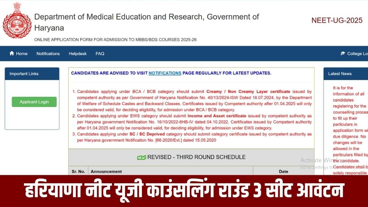 Haryana NEET UG Counselling 2025: हरियाणा नीट यूजी राउंड 3 सीट आवंटन डेट रिवाइज्ड, 24 अक्टूबर को होगा जारी