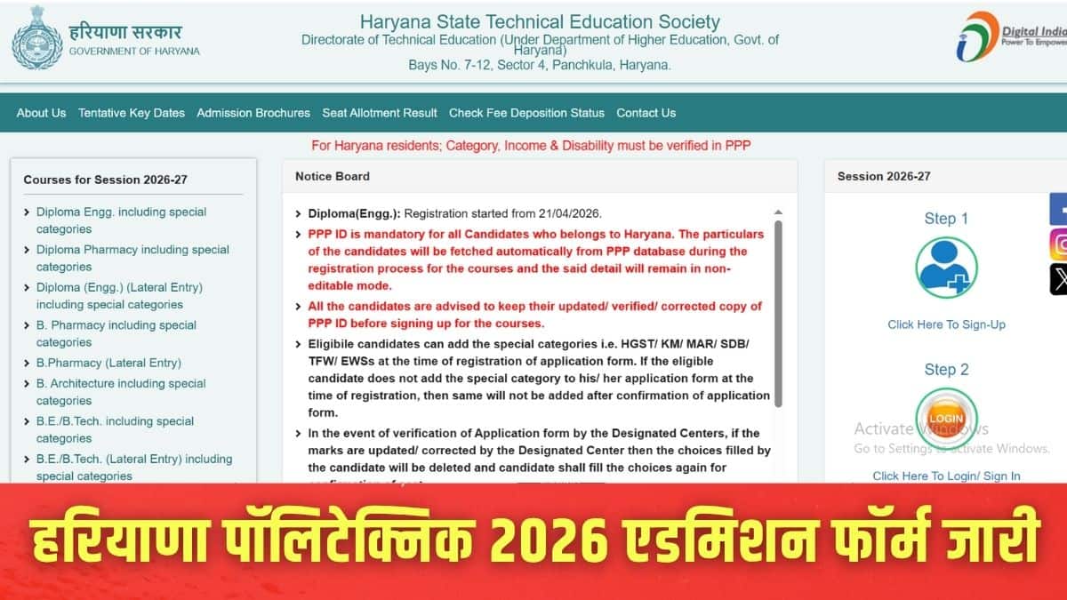 नई दिल्ली: हरियाणा पॉलिटेक्निक एडमिशन 2026-27 के लिए आवेदन प्रक्रिया शुरू हो गई है। हरियाणा स्टेट टेक्निकल एजुकेशन सोसाइटी (एचएसटीईएस) ने डिप्लोमा इंजीनियरिंग, लेटरल एंट्री और फार्मेसी कोर्स के लिए ऑनलाइन रजिस्ट्रेशन शुरू किया। इच्छुक छात्र अब आवेदन फॉर्म भरने के लिए आधिकारिक वेबसाइट techadmissionshry.gov.in पर जा सकते हैं। यह प्रक्रिया सरकारी, सरकारी सहायता प्राप्त और निजी पॉलिटेक्निक संस्थानों में 75% सीटों पर लागू है।