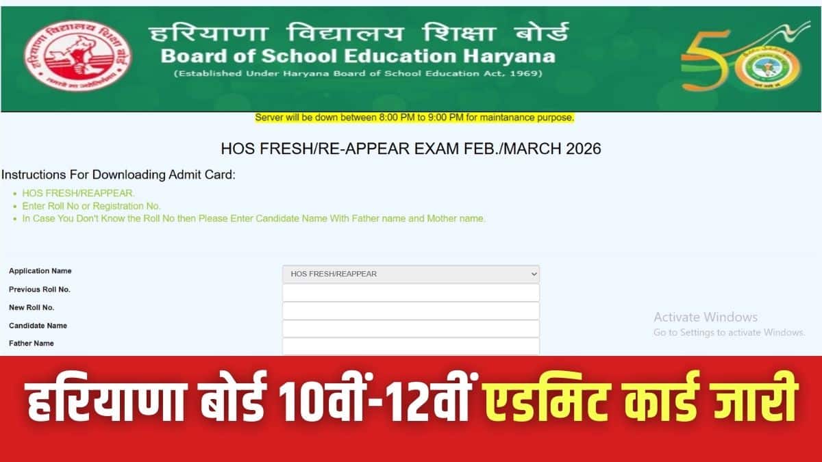 नई दिल्ली: हरियाणा बोर्ड ऑफ स्कूल एजुकेशन (बीएसईएच या एचबीएसई) ने क्लास 10वीं और 12वीं की सालाना परीक्षा 2026 के लिए एडमिट कार्ड जारी कर दिए हैं। एचबीएसई एडमिट कार्ड ऑफिशियल वेबसाइट bseh.org.in पर लाइव हो गए हैं। रेगुलर स्टूडेंट्स स्कूल प्रिंसिपल या ऑथराइज़्ड स्टाफ के जरिए लॉग इन करके उन्हें डाउनलोड कर सकते हैं, जबकि प्राइवेट और ओपन स्कूल (एचओएस) के कैंडिडेट सीधे वेबसाइट से अपने हॉल टिकट ले सकते हैं।