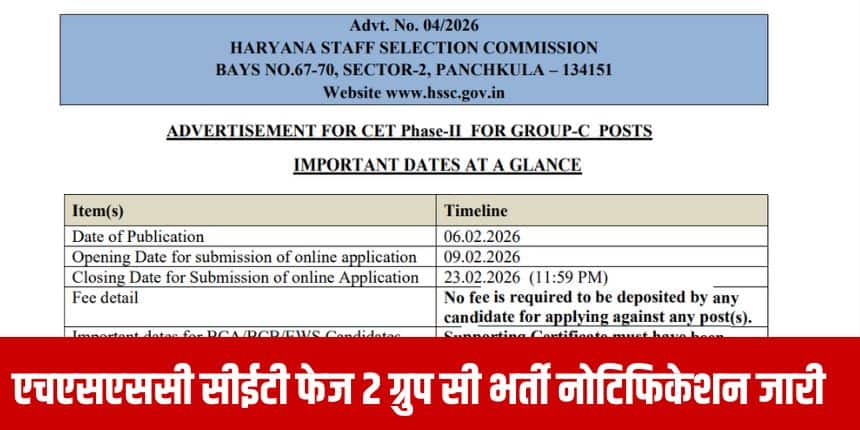 एचएसएससी सीईटी फेज 2 के लिए ऑनलाइन आवेदन प्रक्रिया 9 फरवरी से शुरू होगी। इच्छुक और पात्र उम्मीदवार आधिकारिक वेबसाइट hssc.gov.in के माध्यम से ऑनलाइन आवेदन कर सकेंगे। आवेदन पत्र जमा करने की आखिरी तारीख 23 फरवरी 2026 है।