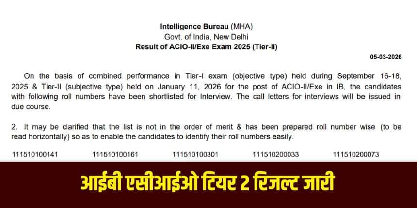 आईबी एसीआईओ टियर-II 2026 का परिणाम पीडीएफ गृह मंत्रालय की आधिकारिक वेबसाइट पर प्रकाशित कर दिया गया है। उम्मीदवार मेरिट लिस्ट पीडीएफ डाउनलोड कर सकते हैं और अपना रोल नंबर देख सकते हैं।