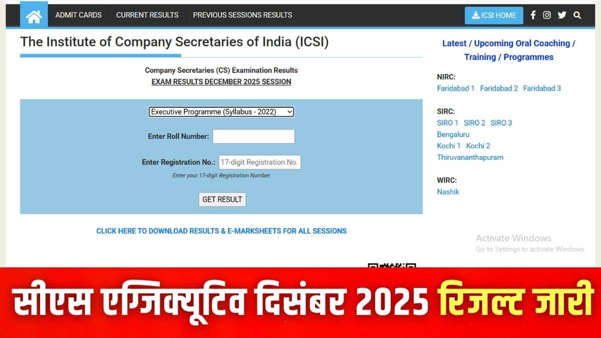 नई दिल्ली: इंस्टीट्यूट ऑफ कंपनी सेक्रेटरीज ऑफ इंडिया (आईसीएसआई) ने आज सीएस एग्जिक्यूटिव प्रोग्राम (सिलेबस 2022) दिसंबर 2025 सेशन के रिजल्ट घोषित कर दिए। यह एग्जाम 22 से 29 दिसंबर, 2025 तक ऑफलाइन आयोजित किया गया । कैंडिडेट ऑफिशियल वेबसाइट icsi.edu पर लॉग इन करके अपने रिजल्ट, ई-मार्कशीट और सब्जेक्ट-वाइज मार्क्स डाउनलोड कर सकते हैं।