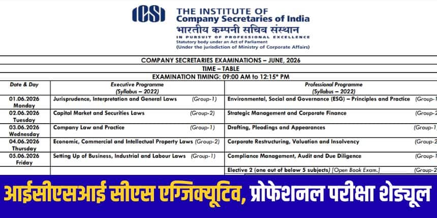 नई दिल्ली : इंस्टीट्यूट ऑफ कंपनी सेक्रेटरीज ऑफ इंडिया (ICSI) ने जून 2026 सत्र के लिए सीएस एग्जिक्यूटिव और प्रोफेशनल प्रोग्राम की परीक्षा तिथियों की घोषणा कर दी है। वर्ष 2022 के पाठ्यक्रम के लिए आईसीएसआई सीएस परीक्षा 1 जून से शुरू होकर 7 जून 2026 को समाप्त होगी।