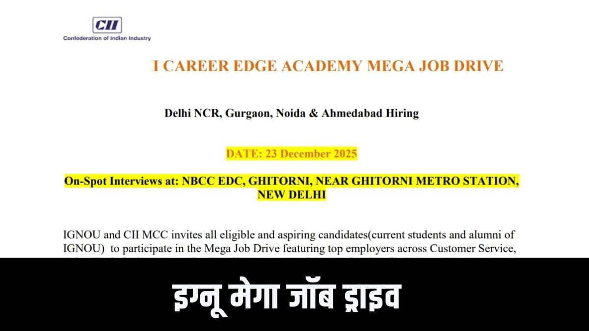 नई दिल्ली : इंदिरा गांधी राष्ट्रीय मुक्त विश्वविद्यालय (IGNOU) भारतीय उद्योग परिसंघ (CII) और करियर एज अकादमी के सहयोग से 23 दिसंबर, 2025 को दिल्ली में एक मेगा जॉब ड्राइव का आयोजन करेगा। इस प्लेसमेंट ड्राइव का उद्देश्य विभिन्न क्षेत्रों में नौकरी चाहने वालों को वॉक-इन इंटरव्यू के माध्यम से सीधे रोजगार के अवसर प्रदान करना है।