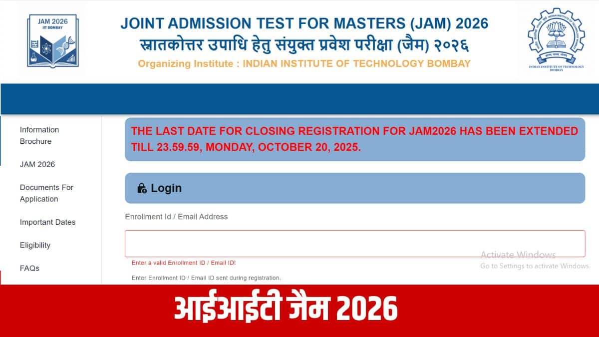 नई दिल्ली : भारतीय प्रौद्योगिकी संस्थान, बॉम्बे (आईआईटी बॉम्बे) की तरफ से संयुक्त प्रवेश परीक्षा मास्टर्स (JAM) 2026 के लिए पंजीकरण प्रक्रिया का कल 20 अक्टूबर 2025 आखिरी दिन है। जिन पात्र उम्मीदवार ने अभी तक आवेदन नहीं किया है, वे आधिकारिक वेबसाइट jam2026.iitb.ac.in के माध्यम से आवेदन प्रक्रिया पूरी कर सकते हैं।