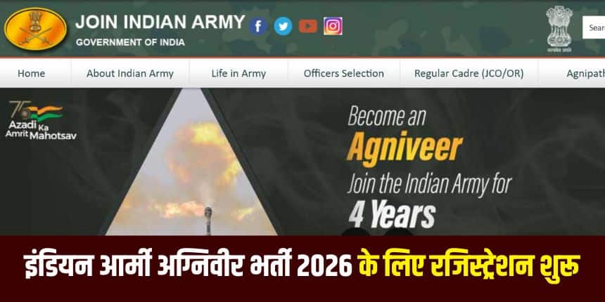 भारतीय सेना में अग्निवीर भर्ती 2026 की अधिसूचना आधिकारिक वेबसाइट joinindianarmy.nic.in पर जारी कर दी गई है। योग्य और इच्छुक उम्मीदवार अपने जोन के अनुसार ऑनलाइन आवेदन कर सकते हैं।