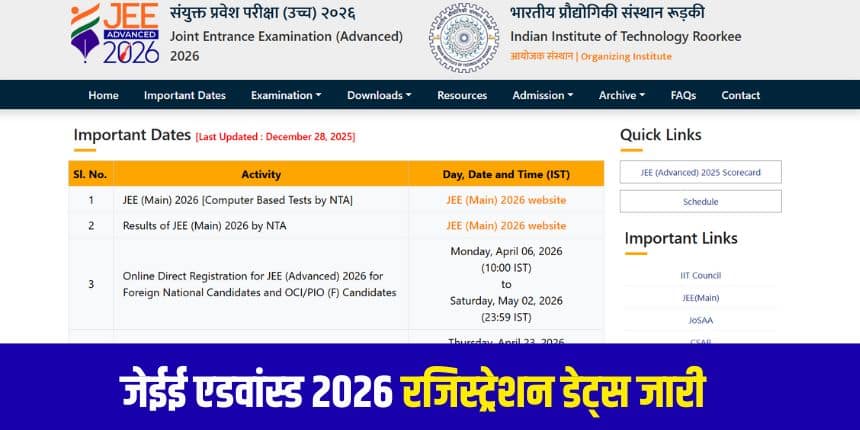 नई दिल्ली : भारतीय प्रौद्योगिकी संस्थान, रूड़की (आईआईटी रूड़की) ने संयुक्त प्रवेश परीक्षा (एडवांस्ड) 2026 के लिए रजिस्ट्रेशन का पूरा कार्यक्रम जारी कर दिया है। जेईई एडवांस्ड के लिए पंजीकरण की प्रक्रिया 23 अप्रैल से शुरू होगी और आवेदन पत्र जमा करने की आखिरी 2 मई 2026 है।