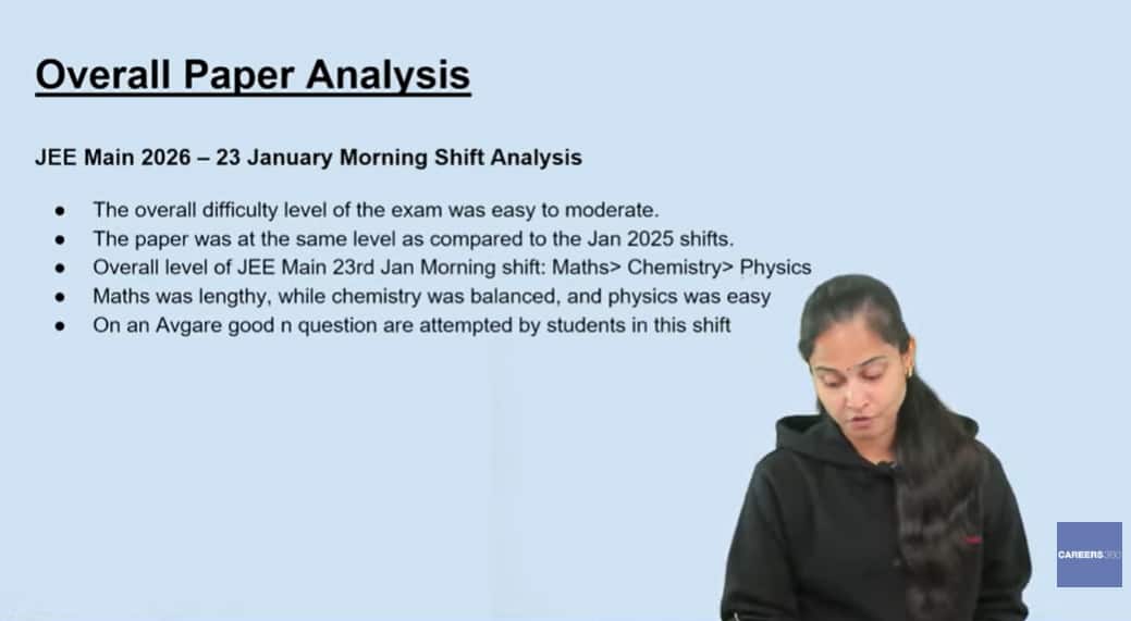 करियर्स360 के सब्जेक्ट एक्सपर्ट्स के अनुसार, जेईई मेन 2026 जनवरी 23 शिफ्ट 1 ओवरऑल पेपर के क्वेश्चन पेपर का एनालिसिस इस प्रकार है। (इमेज-यूट्यूब/BtechCareers360)
