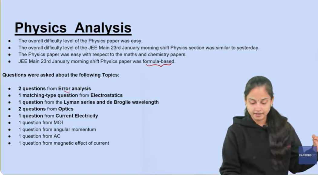 करियर्स360 के सब्जेक्ट एक्सपर्ट के अनुसार, जेईई मेन 2026 जनवरी 23 शिफ्ट 1 फिजिक्स पेपर के क्वेश्चन पेपर का एनालिसिस इस प्रकार है। (इमेज-यूट्यूब/BtechCareers360)