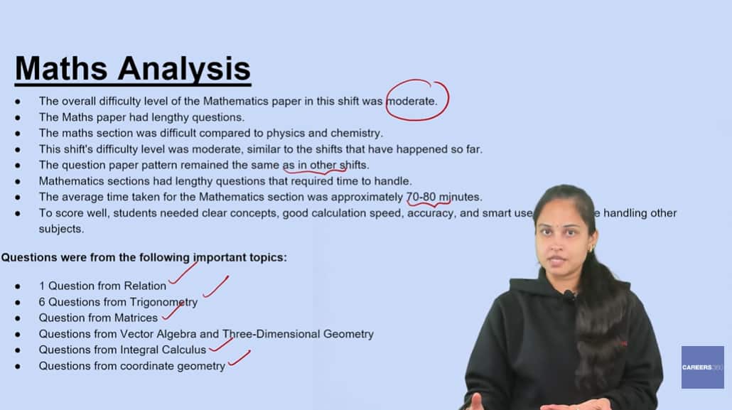 इस सत्र में गणित सेक्शन का ओवरऑल कठिनाई स्तर मध्यम था। गणित के प्रश्नपत्र में लंबे प्रश्न थे। कई प्रश्नों के लिए सावधानीपूर्वक गणना की आवश्यकता थी, जिससे समय प्रबंधन अत्यंत महत्वपूर्ण हो गया। गणित भाग फिजिक्स और केमिस्ट्री की तुलना में अपेक्षाकृत आसान था।