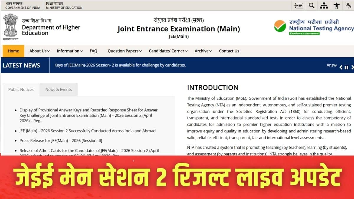 एनटीए द्वारा सेशन 2 के लिए जेईई मेन 2026 रिजल्ट आधिकारिक वेबसाइट jeemain.nta.nic.in पर जारी किया जाएगा। जेईई मेन अप्रैल रिजल्ट 2026 से जुड़ी लेटेस्ट अपडेट्स के लिए उम्मीदवार इस वेबसाइट पर बने रहें।