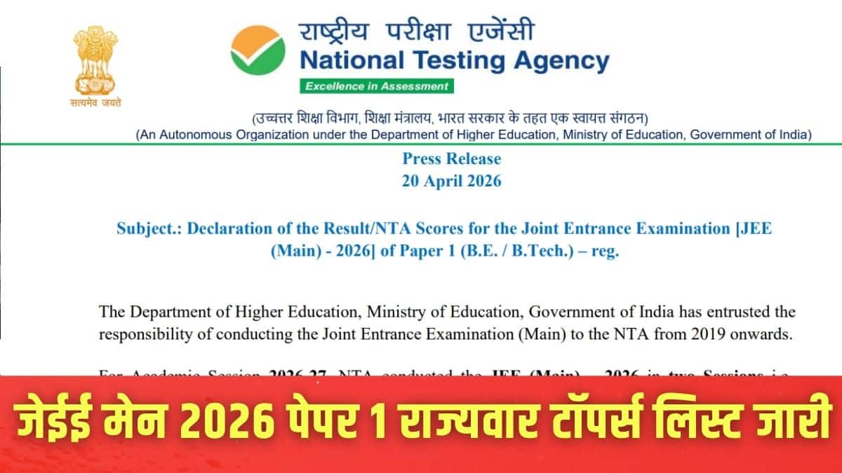 एनटीए ने पेपर 1 के लिए जेईई मेन 2026 टॉपर्स की राज्य-वार लिस्ट अपनी आधिकारिक वेबसाइट jeemain.nta.nic.in पर जारी कर दी है।