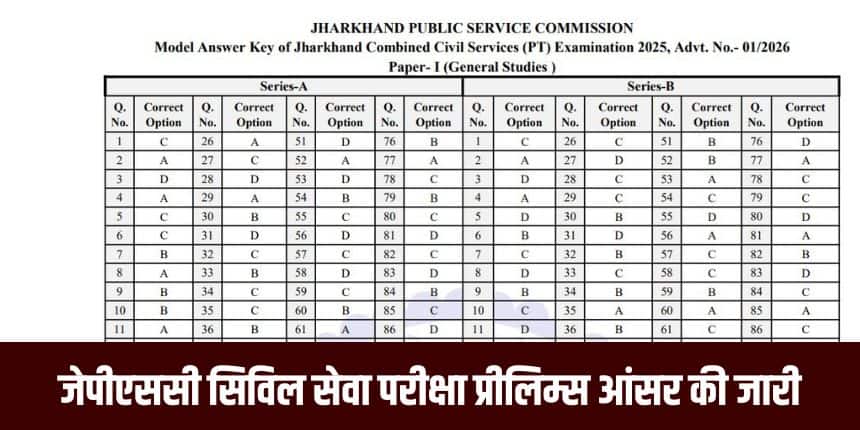 झारखंड लोक सेवा आयोग सिविल सेवा प्रारंभिक परीक्षा उत्तर कुंजी 2026 पीडीएफ प्रारूप में उपलब्ध करा दी है। उम्मीदवार पेपर 1 और पेपर 2 दोनों की उत्तर कुंजी डाउनलोड कर सकते हैं और परिणामों की घोषणा से पहले अपने संभावित स्कोर का अनुमान लगाने के लिए अपने उत्तरों की तुलना आधिकारिक उत्तरों से कर सकते हैं।