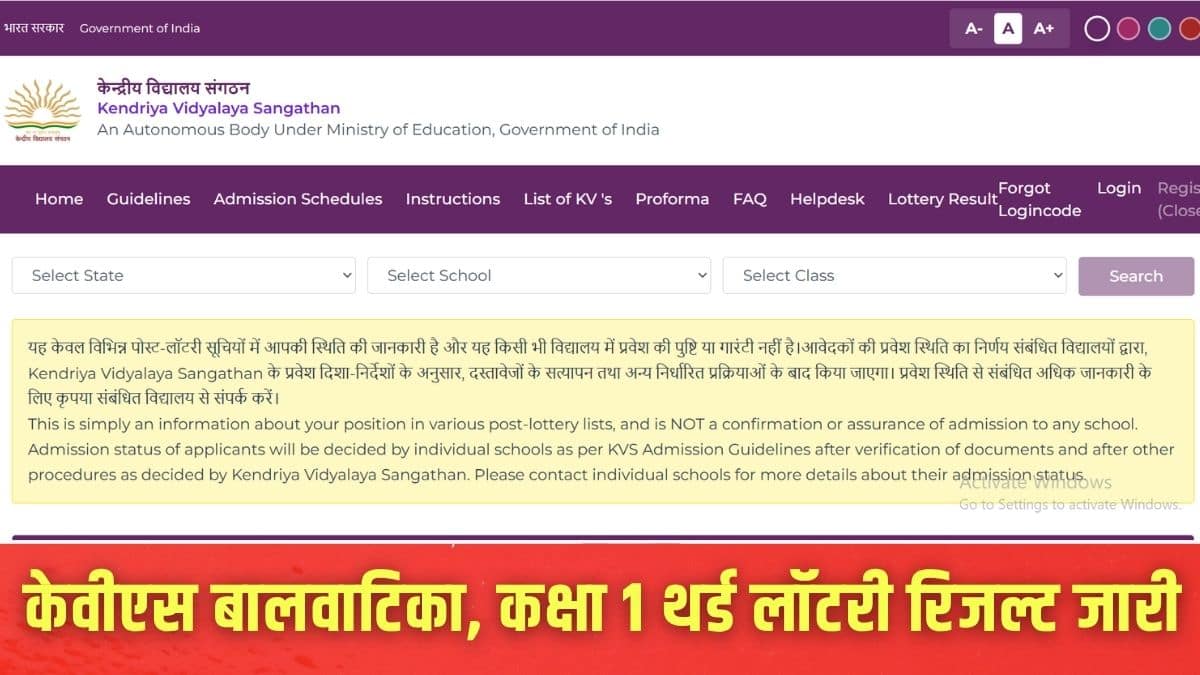यह लॉटरी आरटीई कोटे, सेवा प्राथमिकता श्रेणियों (श्रेणी 1 और 2), और सामान्य श्रेणी की बची हुई सीटों के लिए आयोजित की गई है। केवीएस के नियमों के अनुसार, लॉटरी रिजल्ट जारी होने के बाद भी दस्तावेजों का सत्यापन अनिवार्य है।