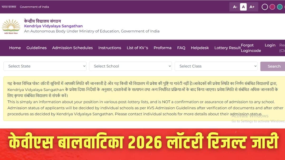 नई दिल्ली: केंद्रीय विद्यालय संगठन (केवीएस) ने वर्ष 2026 के लिए बालवाटिका में दाखिले के लॉटरी नतीजे जारी कर दिए हैं। बालवाटिका-1, बालवाटिका-2 (जहां लागू हो) और बालवाटिका-3 के लिए पहली प्रोविजनल लिस्ट जारी की गई। अभिभावक अब ऑफिशियल वेबसाइट पर चुने गए और वेटलिस्ट में शामिल बच्चों के नाम देख सकते हैं। केवीएस बालवाटिका लॉटरी रिजल्ट 2026 आधिकारिक वेबसाइट kvsangathan.nic.in या admission.kvs.gov.in पर देख सकते हैं।