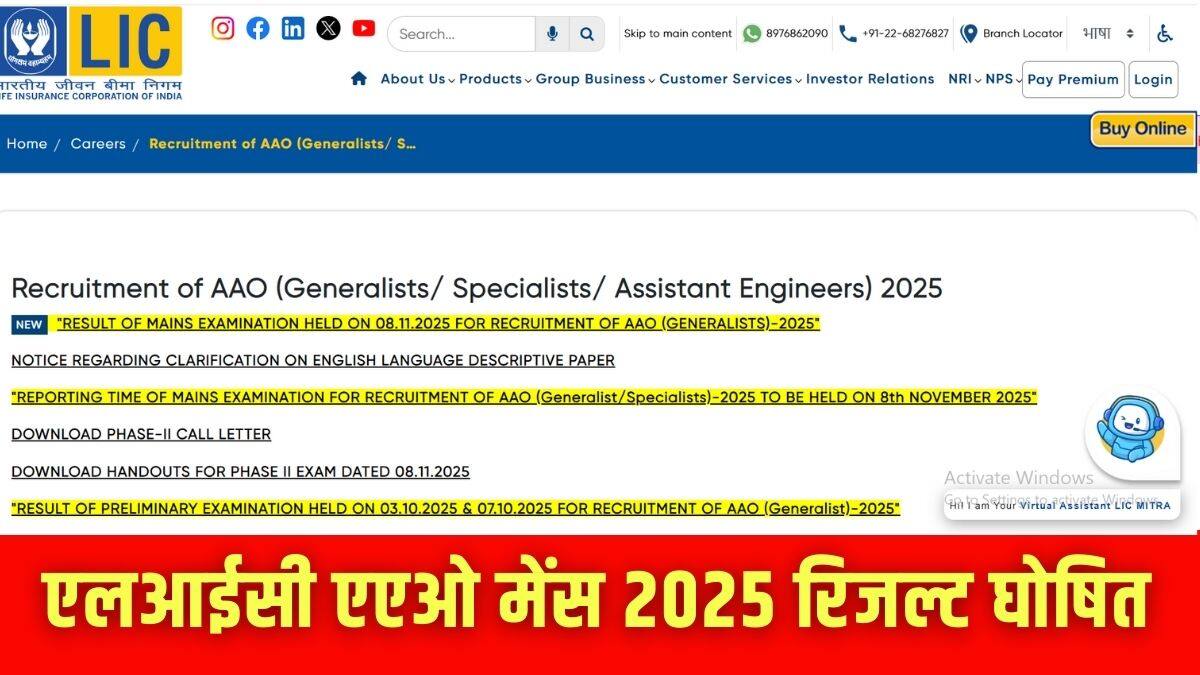 नई दिल्ली: लाइफ इंश्योरेंस कॉर्पोरेशन ऑफ इंडिया (एलआईसी) ने आधिकारिक तौर पर एलआईसी एएओ मेन्स रिजल्ट 2025 घोषित कर दिया है। एलआईसी एएओ फेज-2 परीक्षा के नतीजे एलआईसी की आधिकारिक वेबसाइट licindia.in पर जारी किए गए। सफल उम्मीदवारों की मेरिट लिस्ट पीडीएफ फॉर्मेट में उपलब्ध है, जिसमें इंटरव्यू राउंड के लिए चुने गए उम्मीदवारों के रोल नंबर की लिस्ट है।