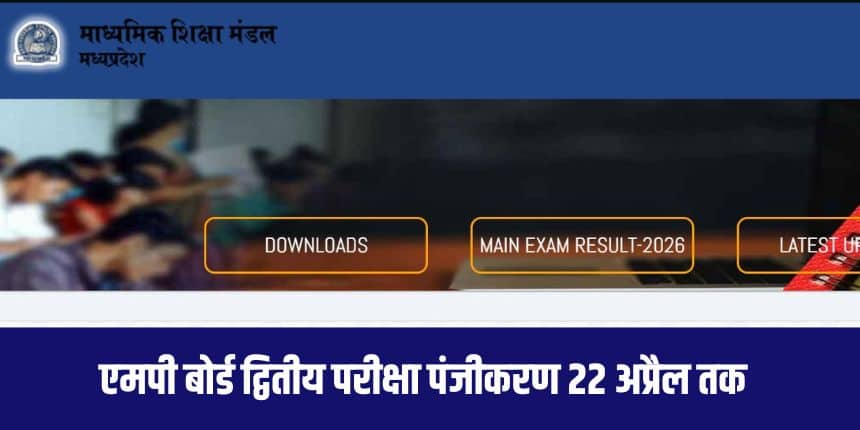 नई दिल्ली : मध्य प्रदेश माध्यमिक शिक्षा बोर्ड (एमपीबीएसई) द्वारा एमपी बोर्ड 10वीं और 12वीं की द्वितीय अवसर परीक्षा के लिए पंजीकरण का कल 22 अप्रैल आखिरी दिन है। आवेदन एमपी ऑनलाइन पोर्टल के माध्यम से भर सकते हैं। द्वितीय अवसर परीक्षा में शामिल होने वाले परीक्षार्थियों को मुख्य परीक्षा की मार्कशीट नहीं जारी की जाएगी।