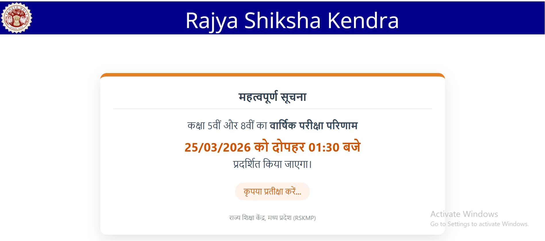 आरएसकेएमपी एमपी बोर्ड 5वीं 8वीं का रिजल्ट अब सुबह 11.30 बजे नहीं दोपहर 1.30 बजे जारी किया जाएगा। (इमेज-आधिकारिक वेबसाइट)