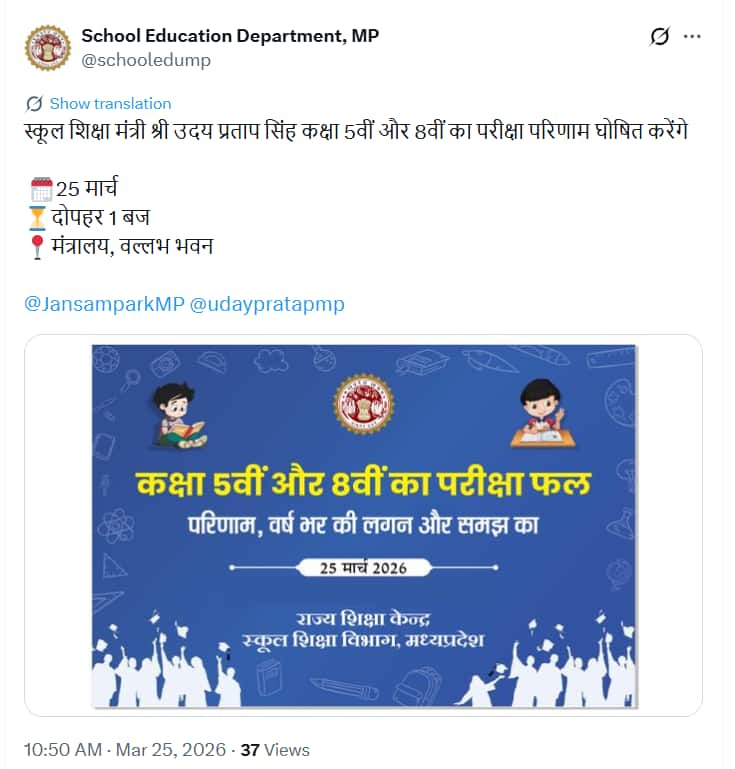स्कूल शिक्षा विभाग के अनुसार, स्कूल शिक्षा मंत्री उदय प्रताप सिंह ने 5वीं और 8वीं कक्षा की परीक्षाओं के परिणाम घोषित किए। (इमेज-एक्स/@schooledump)