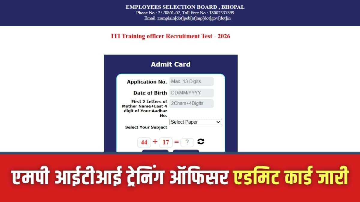 नई दिल्ली: मध्य प्रदेश स्टाफ सिलेक्शन बोर्ड (एमपीईएसबी) ने आईटीआई ट्रेनिंग ऑफिसर रिक्रूटमेंट 2026 के लिए एडमिट कार्ड जारी कर दिया है। यह भर्ती डिपार्टमेंट ऑफ टेक्निकल एजुकेशन, स्किल डेवलपमेंट एंड एम्प्लॉयमेंट के तहत है, जिसमें कुल 1,120 वैकेंसी हैं। कैंडिडेट ऑफिशियल वेबसाइट esb.mp.gov.in पर के माध्यम से एमपी आईटीआई ट्रेनिंग ऑफिसर हॉल टिकट डाउनलोड कर सकते हैं।