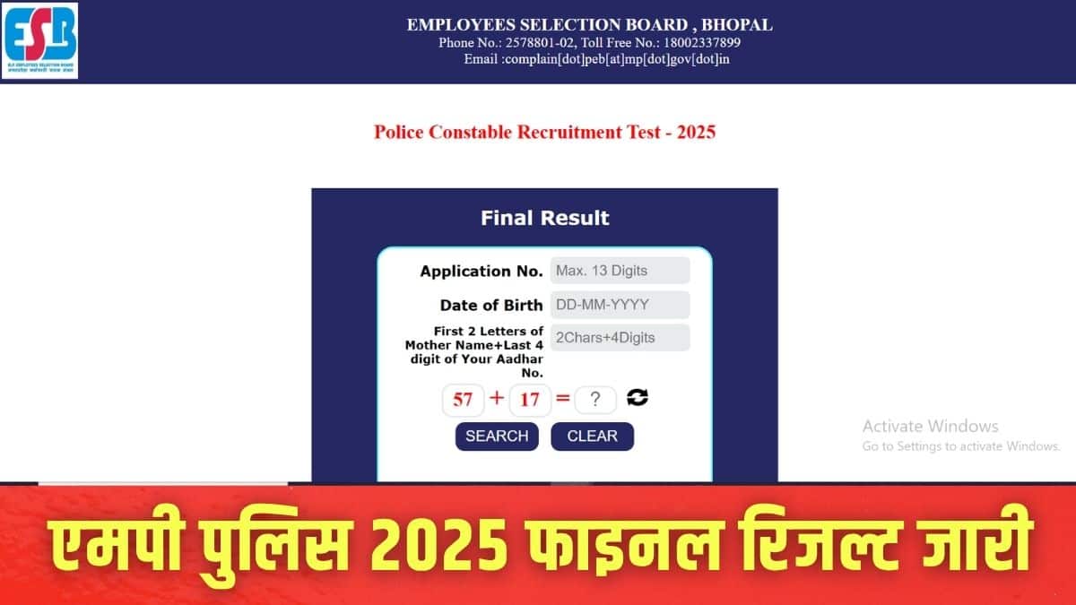 नई दिल्ली: मध्य प्रदेश कर्मचारी चयन बोर्ड (एमपीईएसबी) ने पुलिस कांस्टेबल भर्ती परीक्षा 2025 के अंतिम परिणाम घोषित कर दिए हैं। एमपी पुलिस रिजल्ट 2025 आधिकारिक वेबसाइट esb.mp.gov.in पर जारी किया गया है। मध्य प्रदेश कर्मचारी चयन मंडल ने भर्ती प्रक्रिया में, लिखित परीक्षा, शारीरिक दक्षता परीक्षा (पीईटी), शारीरिक मानक परीक्षा (पीएसटी), दस्तावेज सत्यापन और चिकित्सा परीक्षा के बाद अब अंतिम मेरिट सूची तैयार की है।