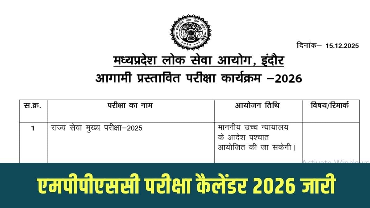 नई दिल्ली : मध्यप्रदेश लोक सेवा आयोग (MPPSC) ने वर्ष 2026 के लिए परीक्षा कैलेंडर जारी कर दिया है। आयोग द्वारा आयोजित होने वाली परीक्षाओं की तैयारी कर रहे उम्मीदवार आधिकारिक वेबसाइट mppsc.mp.gov.in के माध्यम से पूरा परीक्षा कार्यक्रम देख और डाउनलोड कर सकते हैं।