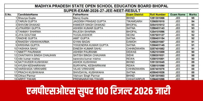 नई दिल्ली : मध्य प्रदेश राज्य मुक्त स्कूल शिक्षा बोर्ड ने सुपर-100 प्रवेश परीक्षा का परिणाम घोषित कर दिया है। विद्यार्थी परीक्षा परिणाम एमपीएसओएस की आधिकारिक बेवसाइट mpsos.nic.in पर देख और डाउनलोड कर सकते हैं। मध्यप्रदेश सरकार के स्कूल शिक्षा विभाग द्वारा आर्थिक रूप से पिछड़े विद्यार्थियों को बेहतर शिक्षा उपलब्ध कराने के लिए यह योजना संचालित की जा रही है।