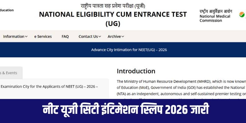 राष्ट्रीय परीक्षा एजेंसी (एनटीए) ने नीट यूजी 2026 की सिटी इंटिमेशन स्लिप जारी कर दी है। परीक्षा के लिए पंजीकृत उम्मीदवार एनटीए की आधिकारिक वेबसाइट neet.nta.nic.in के माध्यम से अपनी सिटी इंटिमेशन स्लिप डाउनलोड कर सकते हैं।