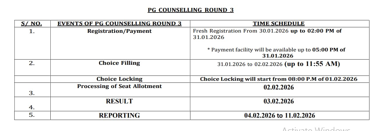 जिन उम्मीदवारों को तीसरे राउंड में सीटें अलॉट की जाएंगी, उन्हें 4 फरवरी से 11 फरवरी 2026 के बीच अपने-अपने आवंटित मेडिकल कॉलेज या संस्थान में रिपोर्ट करना अनिवार्य होगा।