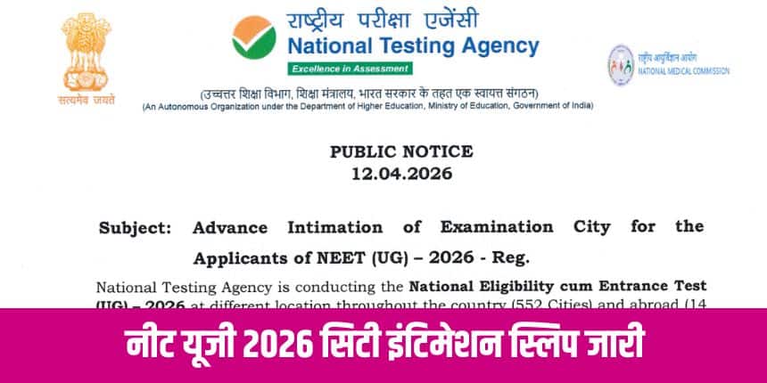 नीट यूजी 2026 की परीक्षा के लिए निर्धारित शहर की सूचना पर्ची उम्मीदवारों को उनके आवंटित परीक्षा शहर और नीट परीक्षा केंद्र के बारे में जानकारी देती है। इससे छात्र परीक्षा के दिन के लिए अपनी यात्रा और आवास की योजना बना सकते हैं।